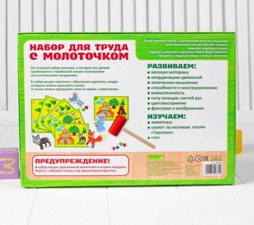 Набор для труда с молоточком Теремок развивает творческий потенциал ребенка, способствует тренировке мелкой моторики, глазомера ребенка, внимания, памяти, знакомит с окружающим миром, с цветом и разнообразными формами.