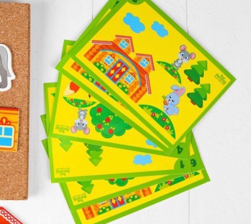 Состав набора: доска-основа, молоточек, 6 схем-карточек, 30 металлических гвоздиков, 22 разноцветных деревянных детали.