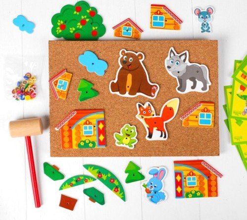 Набор для труда с молоточком Теремок - настольная игра для создания картин из дерева. В этом наборе все детали прибиваются к пробковой основе маленькими металлическими гвоздиками. В набор входят карточки с образцами картинок, следуя которым можно разыграть сказку. А также можно придумать свою историю с животными. Такой игровой набор с молоточком отлично подходит для мальчиков, так как обучает первым навыкам труда. Однако и девочки с удовольствием будут забивать гвоздики, создавая новые и новые картинки.