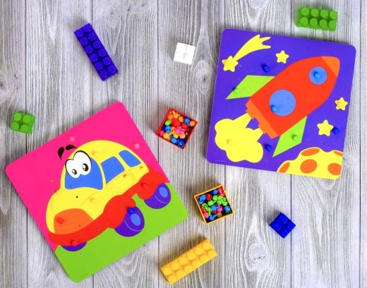 Карточки-трафареты с симпатичными детскими рисунками заполняются гвоздиками. Дети с удовольствием украшают яркие трафареты разноцветными гвоздиками. Кроме основного занятия кружочки-гвоздики можно сортировать, считать, играть с ними на подставке без картинок, например, мама выкладывает ряд из кружков разных цветов и просит малыша повторить такой же ряд.
