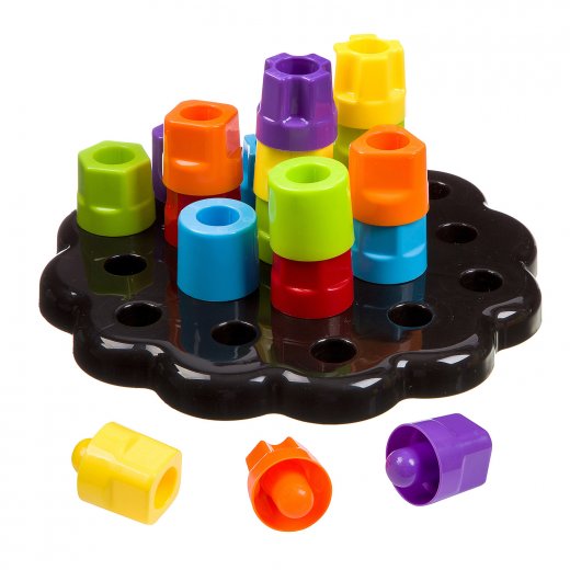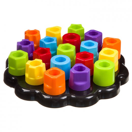 Набор включает в себя основание (игровое поле) и 19 цветных фишек-гаечек. С помощью деталей можно придумать интересные игры на изучение цветов и форм, выложить различные узоры.