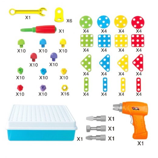 Конструктор-мозаика с инструментом - это отличная развивающая игрушка. Чтобы ребенку было проще создавать картины, в комплекте предусмотрена инструкция с образцами, по которым можно собрать красочные узоры и объемные вертикальные фигуры. Дрель прекрасно дополняет игру и позволяет быстро и легко собирать и разбирать мозаики благодаря возможности сменить направление вращения. В комплект набора входит удобный чемоданчик для хранения деталей, одна сторона которого выступает основой для сборки мозаики. В комплект также входит отвертка и гаечный ключ
