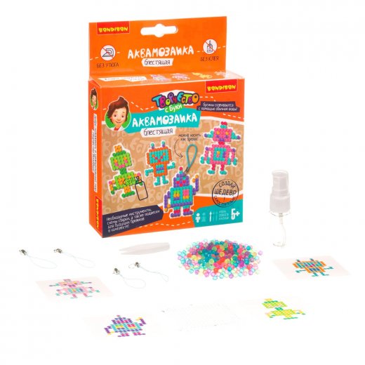 Аквамозаика блестящая Роботы Bondibon – это весьма интересный и занимательный подарок для юного любителя мозаик. Аквамозаика под воздействием жидкости превращается в объёмную фигурку, с которой можно играть. Юному любителю творчества необходимо лишь выбрать шаблон, затем выложить бисер по трафарету и смочить полученную фигурку водой. И вуаля – произведение искусства готово! Самые любимые поделки можно носить с собой как брелок.
