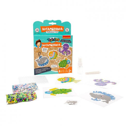 Состав набора: 1000 бусин, пластиковая основа-планшет, распылитель воды, карточки-трафареты, пинцет, подвески для создания брелоков, самоклеящиеся глазки.