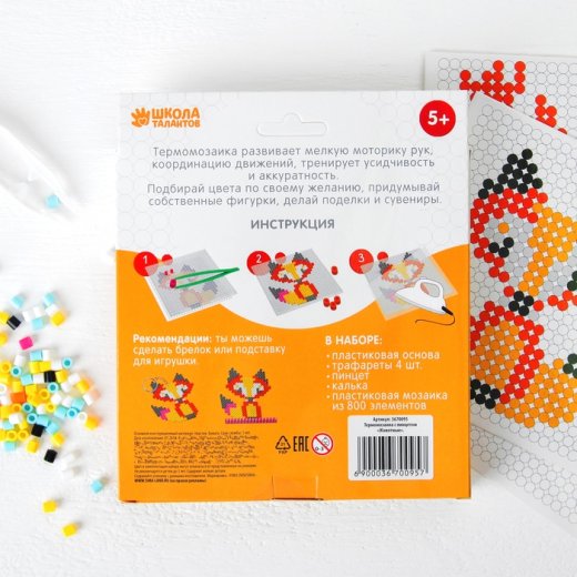 Термомозаика Животные – это набор, который понадобиться маленьким любителям творить с мелких элементов. Набор состоит из 800 элементов разных цветов. С помощью этого набора можно создавать различные яркие картинки, которые будут радовать глаз, а потом станут приятным воспоминанием о детстве.