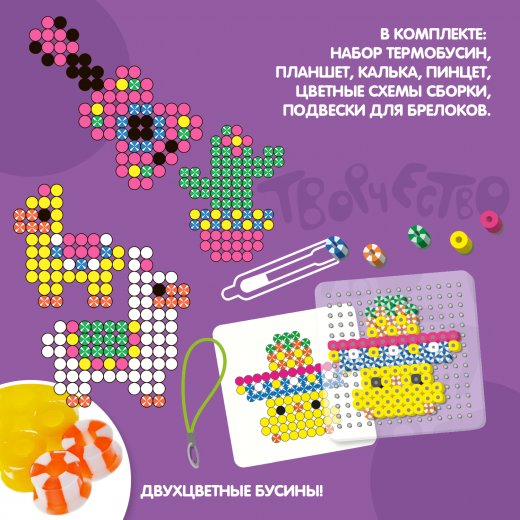 В набор входят термобусины, планшет, калька, цветные схемы и подвески для брелоков. Рекомендуется гладить на низких температурах и только под присмотром взрослых.
