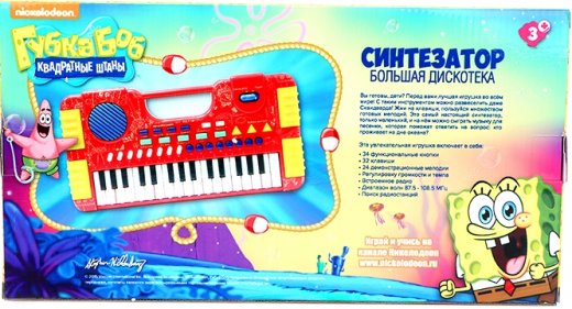 Синтезатор Губка Боб Большая дискотека – это весьма интересный и занимательный подарок для ребенка. Игрушечный музыкальный инструмент выполнен из высококачественного пластика и совершенно безопасен даже для самых маленьких музыкантов. Многофункциональный синтезатор Губка Боб познакомит ребёнка с увлекательным миром музыки. С этим музыкальным инструментом не придётся скучать: слушайте любимое радио, воспроизводите уже готовые мелодии или создавайте свои! У синтезатора 34 функциональные кнопки, 32 электронные клавиши, 24 демонстрационные мелодии, регулировка громкости и темпа, встроенное радио, диапазон волн 87.5 - 108.5 МГц., поиск радиостанций. Как видите ребенку занимаясь с ним не придется скучать. Увлечет он его в игру надолго и с азартом.
