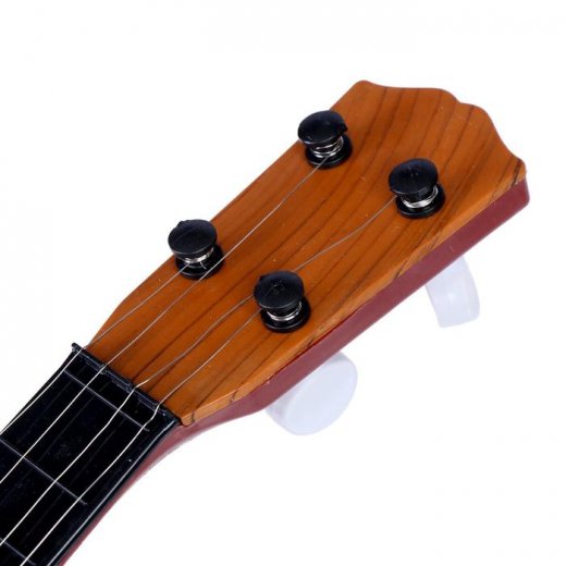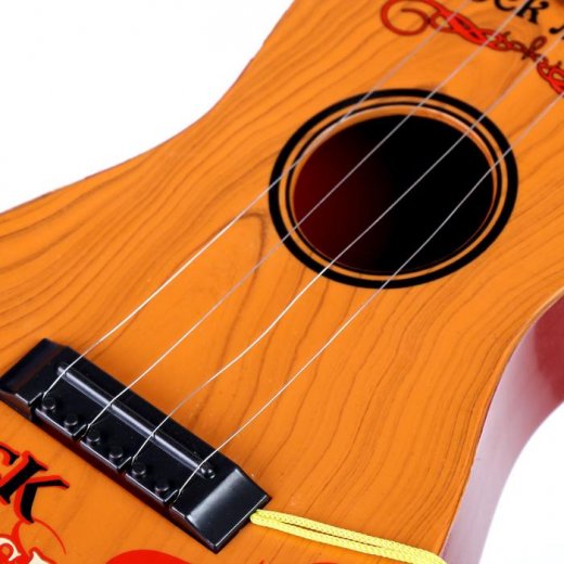 Гитара выполнена из пластика, проста в использовании, имеет 4 струны и медиатор для игры.