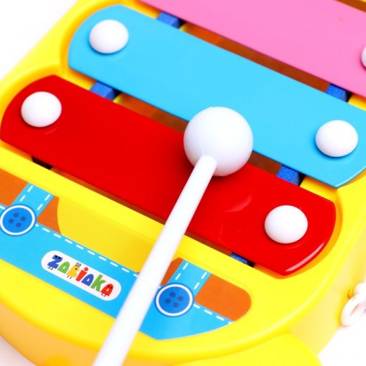 Металлофон имеет 6 тонов, в комплекте есть 2 палочки.