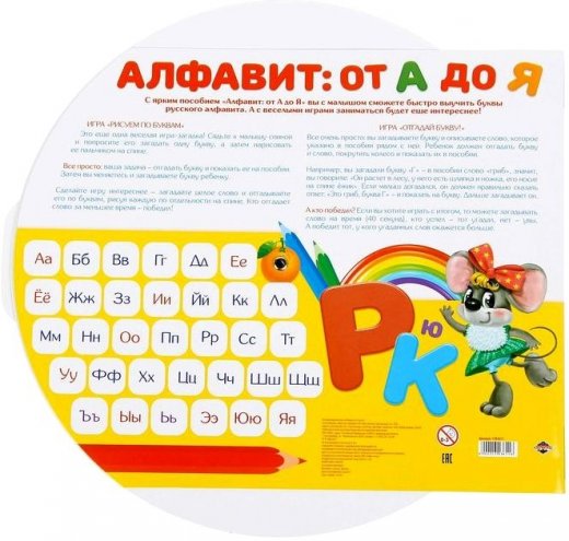 Интерактивная игра Алфавит от А до Я – представляет собой пособие по изучению русского алфавита для самых маленьких! Крутите колесо и знакомьтесь с буквами. Рядом с каждой расположен сектор, в котором написано слово и есть красочная картинка. Так малыш не только выучит азбуку, но и расширит словарный запас! Это интерактивное колесо подойдёт для обучения как дома, так и в дошкольных учреждениях. На обороте вы найдёте 2 весёлые игры, с которыми заниматься будет ещё интереснее! Отгадывайте буквы и слова различными способами.