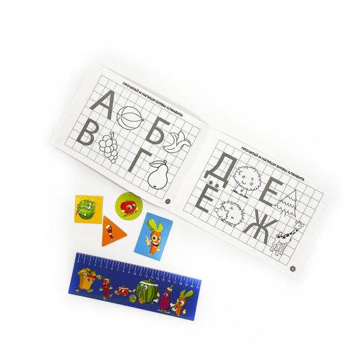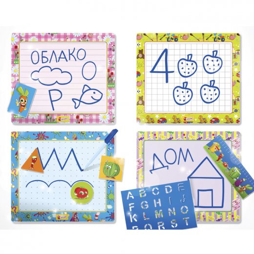 На четырех планшетах с различной разлиновкой (в линию, в клетку и точками) можно рисовать стираемым маркером рисунки, буквы и цифры из тетради с заданиями. Прилагаемые линейка и трафарет латинских букв помогут чертить аккуратные линии и изучать алфавиты иностранных языков.