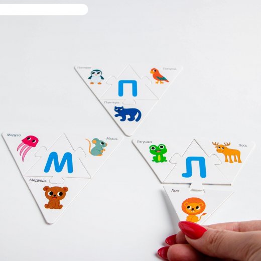 Для каждой буквы предназначено 3 детали пазла с животным на эту букву. Задача ребёнка - соединить букву с соответствующими животными. Например, к букве "л" нужно присоединить лягушку, льва и лося. В результате получится большой треугольник с буквой "л".