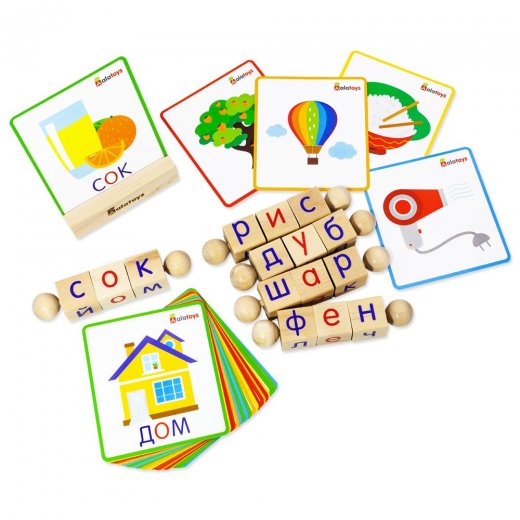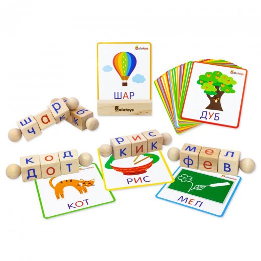 В комплекте 15 подвижных фигур, соединенных по 3 на 5 палочках с круглыми фиксаторами. Для занятий предлагаются 24 картонные карточки с рисунками и названиями изображенных предметов, а также подставка для них. Обучающий материал выполнен из массива березы и обработан лаком, который оберегает дерево от загрязнения и бактерий.