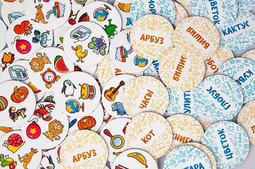 - Остальные жетоны раскладываются на столе (что должно быть сверху: слова или картинки, зависит от варианта игры)