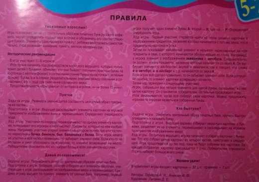 Буквы, обозначающие гласные и согласные звуки, напечатаны разным цветом на разном фоне. А поверхность каждой буквы (кроме «ы», «ь», «ъ») сплошь покрыта картинками; они изображают те предметы, названия которых начинаются со звука, обозначаемого этой буквой. Специальные карточки предлагают ребенку выполнить 3 варианта веселых развивающих игр, прохождение которых откроет новую и полезную информацию.