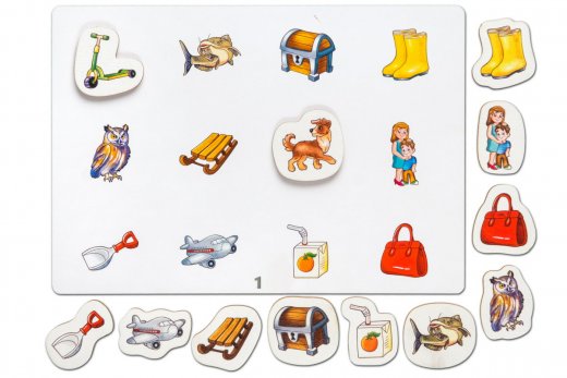 4. Игра «Назови правильно». Рассмотрите вместе с ребенком все карточки и предложите выбрать одну из них. Фигурки разложите на столе. Предложите ребенку правильно назвать все картинки на карточке и закрыть их соответствующими фигурками.