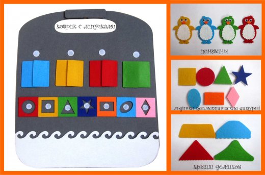 В своем визуальном исполнении коврик-игралка нацелен на развитие цветового восприятия малыша. К коврику прилагается краткая информация о пингвинах, стишки о них и загадки о геометрических фигурах.