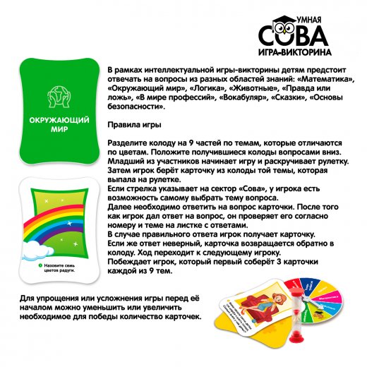 Разделите вопросы на 9 частей по темам: математика, окружающий мир, логика, животные, правда или ложь, в мире профессий, вокабуляр, сказки, основы безопасности. Игру начинает младший участник. Раскрутите рулетку и возьмите из колоды карточку той темы, на которую указала стрелка. Отвечайте на вопросы и проверяйте ответы по номеру. Оставьте у себя карточку, если все правильно. Побеждает участник, который первым соберет 3 карточки каждой из 9 тем. В игровой форме подготовьте ребенка к школе, развивайте логику, скорость мышления, память, усидчивость, внимательность и наблюдательность.
