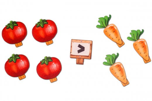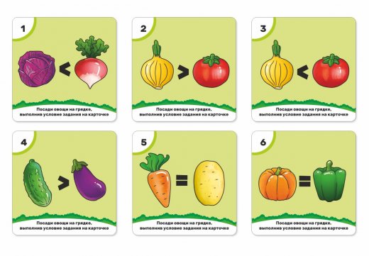 4. Игра «Математика на грядке». Предложите ребенку посадить овощи на грядках. Для этого придумайте простые и сложные задания, используя карточки с изображением цифр и арифметических знаков. Например: посади три одинаковых жёлтых овоща на первой грядке, на средней грядке два разных красных овоща, на грядке справа посади на один овощ больше, чем на грядке слева и т.п.