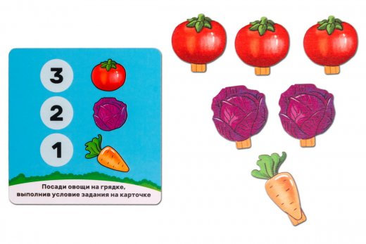 1. Игра «А у нас на грядке...». Рассмотрите игровой набор вместе с ребенком. Уточните, что такое огород, что выращивают на грядках. Попросите назвать овощи, посчитать сколько овощей находится в каждом ящике. Расскажите, как ухаживать за огородом, чтобы вырастить урожай (посадить семена, поливать рассаду, удалять сорняки, охранять урожай от птиц, используя огородные пугала).