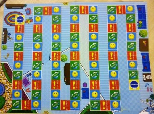 Состав набора: игровое поле (39,5х29,5 см), карточки (80 штук), кубик, фишки (4 штук), инструкция.