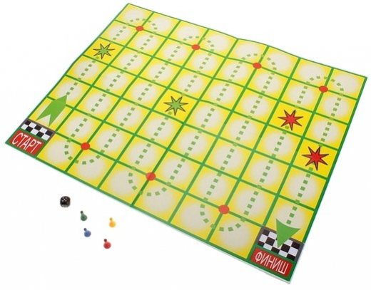 Состав набора: игровое поле, 5 карточек, 4 фишки, 2 игральных кубика.