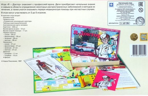 Настольная игра Я доктор – познакомит ребенка со строением тела человека, а также с симптомами самых распространенных болезней, расскажет о работе врача в поликлинике и в больнице. В игровой форме ребенок научится основам оказания первой помощи и узнает, когда нужно срочно звонить в скорую. В ходе игры юный доктор должен будет осмотреть больного, поставить диагноз и назначить лечение. “Я – Доктор” – это игра, с помощью которой ребенок сможет побывать настоящим врачом и узнать, как проходит его рабочий день! Как важно вовремя успеть к пострадавшему, правильно поставить диагноз больному и выписать соответствующие рецепты.