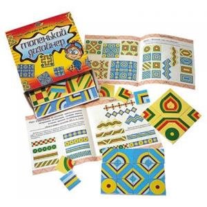 Состав набора: 6 видов карточек с нанесенными на них элементами узора (всего 160 шт.), методические рекомендации, мозаика для детей 3 – 5 лет, геометрическая игра на анализ и синтез для детей 5 -7 лет.