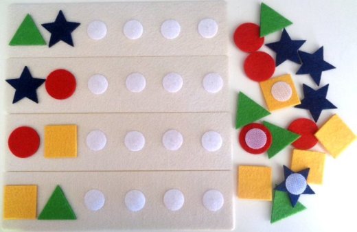 1. Сортируйте геометрические фигуры по форме, по цвету; 2. Считайте фигурки; 3. Продолжайте последовательность - прикрепляйте фигуры по образцам на плашках. 4. Поиграйте в игру Чудесный мешочек . Опустите руку в сумку и на ощупь попробуйте угадать, какая фигурка у вас в руке. Первые 2 фигурки приклеены к карточке (как образец для дальнейшей расстановки фигур), остальные фигурки крепятся на текстильную липучку Сумочка также закрывается на липучку.