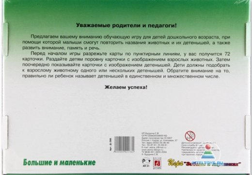 Игра-лото Большие и маленькие – поможет ребенку запомнить названия животных и их детенышей, таких как: лев, тигр, верблюд, бобёр, овца, олень, корова, коза, медведь, белка, индюк, лягушка, утка, мышь, курица, слон, лиса, волк, ёж, заяц, лошадь, свинья, кошка, собака. Играть можно в одиночку или с друзьями – например, в группе детского сада. Игра представляет собой красочное лото. Разрезав большие карты по пунктирным линиям, вы получите 72 картинки с изображением 24 взрослых животных и их детенышей в единственном и во множественном числе. Задача игроков – собирать ряды карточек с одинаковыми животными, например, «ёж – ежонок – ежата».