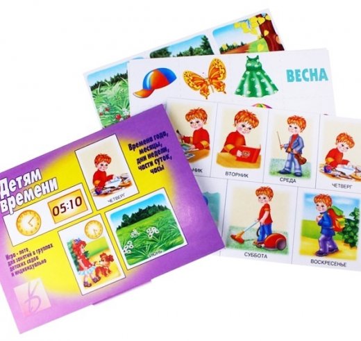 Игра-лото Детям о времени – познакомит ваших детей с особенностями каждого из четырех времен года: зима, весна, лето, осень, а также позволит освоить такие непростые для ребенка понятия как месяцы, дни недели, части суток, часы. Перед началом игры разрежьте карты по пунктирным линиям. Есть карточки изображающие людей разного возраста. Карточки-иллюстрации раскладываются по смыслу (например, дни недели), затем ребенок рассказывает о том, как он проводит свою неделю, что он делал на прошлой неделе и т.п.