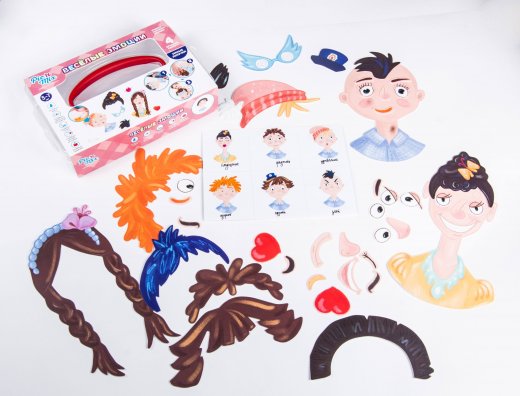 Этот необычный конструктор вызывает море радости, смеха и новых открытий! Ведь можно до бесконечности примерять на картонную основу нахмуренные брови, удивленные глаза, задорную улыбку и множество других частей, комбинируя их в самые забавные варианты.