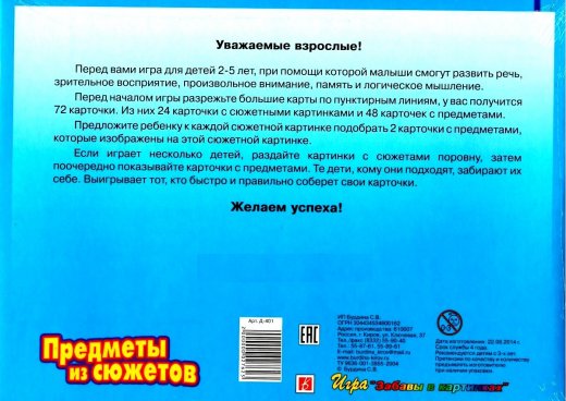 Развивающая игра Предметы из сюжетов – это весьма интересная и занимательная игра-лото для детей на развитие речи. Перед игрой большие картонные карты разрезаются по пунктирным линиям, получается 72 карточки. Из них 24 карточки с сюжетными картинками, а 48 – с предметами. К одной сюжетной картинке малыш подбирает две карточки с соответствующими предметами. Пример – на обложке. Играть можно одному и вдвоем, и втроем. Тогда карточки выкладываются по очереди, те дети, кому они подходят, забирают карточки себе. Выигрывает тот, кто собрал больше карточек.