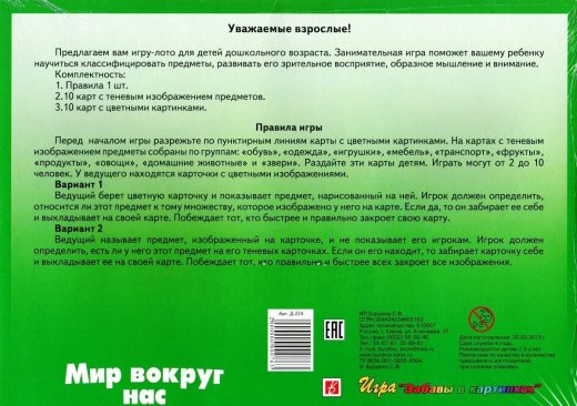 Состав набора: 10 карточек с теневым изображением предметов, 10 карточек с цветными картинками, правила.