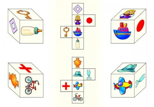 Развивающая игра Найди кубик – это весьма интересное и увлекательное занятие для ребенка. Игра служит детям дошкольного и младшего школьного возраста в познании окружающего мира и предметов окружающих нас в повседневной жизни. Игра проходит по принципу сборки пазла. Малышу предлагается подобрать к каждой развертке кубика по два рисунка с целыми кубиками, причем на каждой картинке видно только три стороны целого кубика. Если отверстия "пазлов" подошли, значит карточки выбраны правильно, если же нет значит нужно посмотреть и подумать. На первых этапах можно подсказывать ребенку, чтобы он сам начинал мыслить логически.