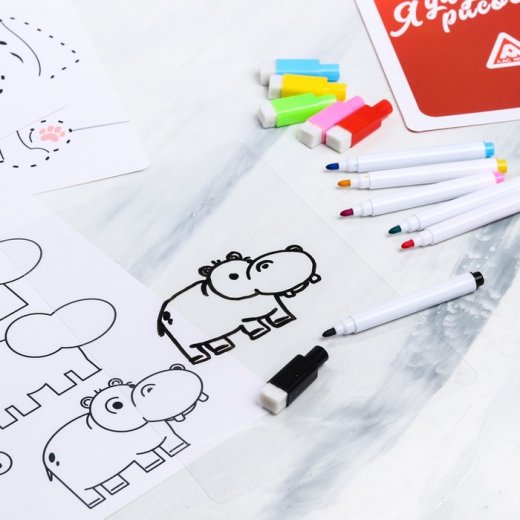 В заданиях этого типа карточки не ламинированные, то есть на них нельзя рисовать. Для них понадобится пустая ламинированная карта (на ней-то и нужно рисовать). На каждой карточке есть схема, как пошагово нарисовать то или иное животное или предмет.