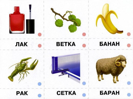 1)Раздайте детям карточки с картинками, отмеченными красными точками, поровну. Дети должны подобрать к ним сначала слова, а затем карточки ч картинками, помеченными синими точками так, чтобы названия отличались только одной буквой. Дети должны рас казать какими буквами отличаются слова. Выигрывает тот кто соберет свои карточки быстрее других и правильно расскажет, чем отличаются слова.