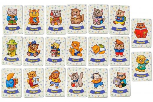 1. Игра «Давайте познакомимся!». Предложите ребенку отправиться в Мяу-город и познакомиться с его обитателями. Рассмотрите набор карточек с котами, назовите имена, предложите объяснить, почему их так зовут: Соня, Дымок, Кекс, Джаз. Обратите внимание на внешние особенности, характер, настроение, обсудите возможные интересы и умения каждого жителя Мяу-города. 2. Игра «Парочки». Вариант 1. Один экземпляр парных карточек разложите на столе перед игроками. Оставшиеся карточки показывайте по одной с просьбой найти пару ;одинакового, такого же кота;. Игрок, первым нашедший нужного кота, забирает карточки себе. Вариант 2. Разложите все карточки вперемешку. Предложите игрокам собрать как можно больше парных котов. Все игроки действуют одновременно без очередности ходов. Победитель игры определяется по наибольшему количеству собранных карточек. 3. Игра «Мемо». Разложите карточки на столе рубашкой вверх. Определите очередность игроков, предложите первому игроку открыть 2 карточки. Если коты совпадают, игрок забирает обе карточки и снова делает ход. Если коты оказались разными, игрок переворачивает карточки, возвращая их на прежнее место, а ход переходит к другому игроку. Выигрывает игрок, собравший наибольшее количество котов. Вариант для одного игрока: очередность игровых действий, описанных выше, выполняется одним игроком. В зависимости от интереса и возраста ребенка можно постепенно увеличивать количество парных карточек. 4. Игра «По порядку становись!». Расскажите ребенку, что коты выстроились в ряд для участия в выставке кошек, но постоянно путают свои места.Разместите 5-7 карточек с разными котами в ряд на столе и попросите запомнить их расположение. После того, как ребенок закроет глаза, поменяйте местами две карточки. Открыв глаза, ребенок должен вернуть котов на их прежние места.Затем поменяйтесь ролями - ребенок меняет котов, а взрослый угадывает. Для усложнения игры увеличивайте количество карточек в ряду. 5. Игра «11 котов». Игра предусмотрена для двух игроков. Положите на стол 11 карточекиз игрового набора. Первый игрок берет на свое усмотрение 1, 2 или 3 котов. Затем второй игрок берет из оставшихся карточек по своему усмотрению 1, 2 или 3. Так поочередно оба игрокав свой ходберутне более 3 карточек.Проигрывает тот игрок, кому придется взять последнего кота. Пробуйте рассчитать ход соперника, чтобы выиграть. 6. Игра«Мяу-приключения». Попросите ребенка выбрать любую карточку из игрового набора. Предложите придумать веселую историю, которая могла бы произойти с выбранным персонажем: объяснить происхождение его имени, описать характер, рассказать, какие приключения произошли с ним, придумать название своему рассказу.