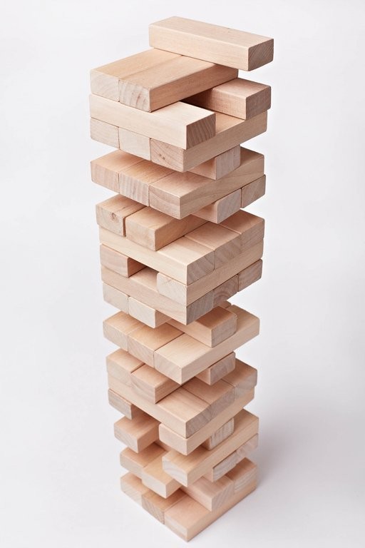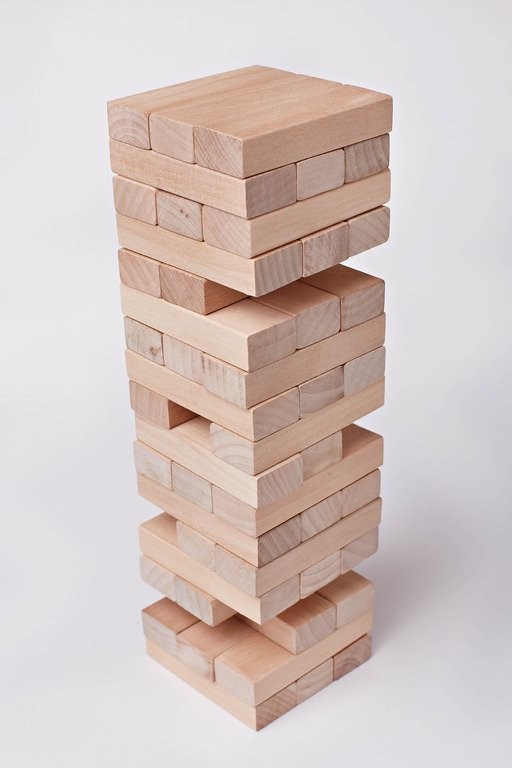 Для начала из брусков строится башня. На каждом уровне по бруска. Каждый следующий уровень перпендикулярен предыдущему. Когда башня построена игроки начинают по очереди тянуть по бруску из любого места башни (брать бруски с самого верхнего уровня, конечно, нельзя) и класть из на верх башни по тому же принципу, что и при ее строительстве. Положив брусок на башню надо подождать несколько секунд. Если башня не обрушилась- вы молодец! Тянет следующий. Если обрушилась, то вы проиграли, а тот игрок, что тянул предыдущим победил.