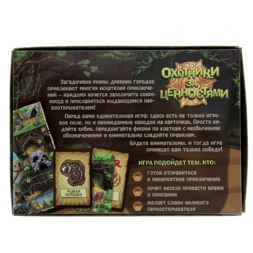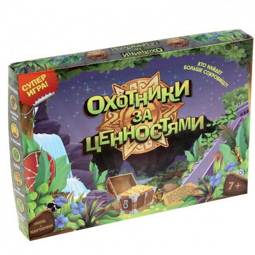 Настольная игра «Охотники за ценностями» это целый мир, населенный артефактами и сокровищами. Игрокам нужно лишь приложить усилия, чтобы завоевать этот таинственный мир. Эта игра имеет элементы ходилки и карточной игры, соединенных вместе. Так, игроки отвечают на вопросы и выполняют задания в зависимости от того на какую клетку игрового поля их занесла жизнь.