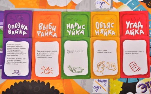 - «Объясняйка» — по трём словам нужно угадать, что пытался описать ребёнок. Например, «курица, суп и компот» — это обед!