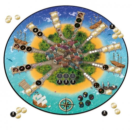 На игровом поле изображён остров и десять причалов, каждый из которых представляет собой одно из сочетаний изображений на кубиках. В начале каждого хода на поле Вы видите те комбинации символов, получив которые игрок может заработать себе монету.