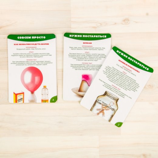 Внутри вы найдёте 2 вида опытов: простые и посложнее. К каждому из них прилагается список необходимых предметов, порядок действий и описание того, что должно получиться, а также объяснение, почему процесс протекает именно так.