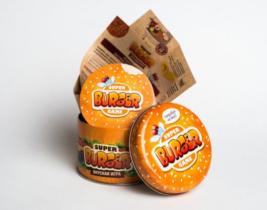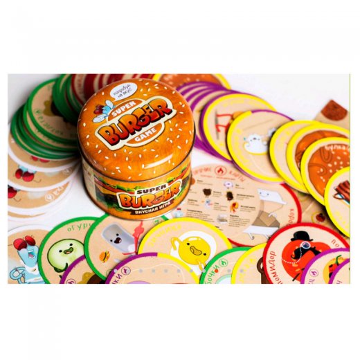 Настольная игра "Super Burger" - это игра, в которой игроки должны приготовить бургер с начинкой из карт. Все ходят по очереди, а тот, кто положит булочку наверх стопки, забирает готовый бургер себе.