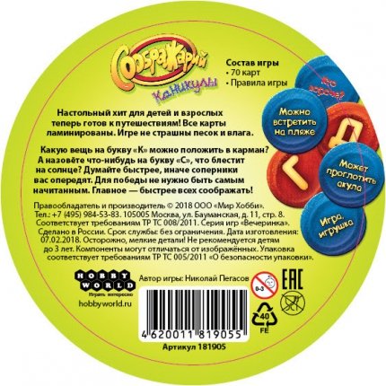 Настольная игра "Соображарий. Каникулы" - это продолжение известной серии игр-викторин для всей семьи. В этой специальной версии для путешествий вас ждёт новая форма коробки и карт! Теперь вы сможете взять любимую игру куда угодно - в кафе, в парк, на природу, да даже на море - карты не боятся ни воды, ни влаги за счёт ламинирующего покрытия.