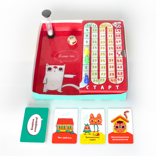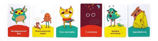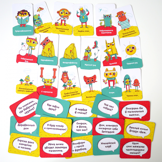 В этой веселой и полезной игре все термины располагаются на карточках с яркими и запоминающимися персонажами. Именно поэтому все части речи, падежи и склонения становятся предельно понятными и прочно закрепляются в памяти. А чтобы научиться их замечать и понимать, в игре используются карты с забавными словосочетаниями и предложениями - с ними точно не соскучишься!