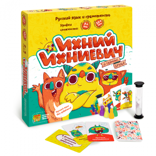 В "Ихний Ихниевич" можно играть даже с первоклашками! В игре есть три уровня сложности: можно выбирать карточки в соответствии с пройденными темами и уровнем подготовки ребенка. Кроме того, предусмотрено 4 варианта правил: как скоростные, так и "на подумать", с большим количеством игровых элементов. В результате изучение русского языка становится простым, приятным и увлекательным занятием.