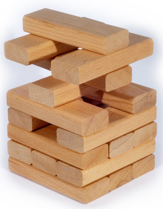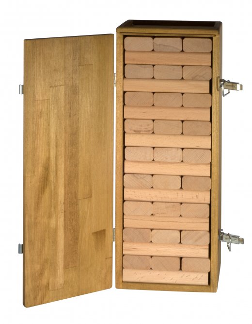 Для начала участники строят башню, состоящую из 54 деревянных брусков. На каждом уровне по 3 бруска. Каждый следующий уровень перпендикулярен предыдущему. Когда башня построена игроки начинают по очереди тянуть по бруску из любого места башни (брать бруски с самого верхнего уровня, конечно, нельзя) и класть их на верх башни по тому же принципу, что и при ее строительстве. Положив брусок на башню надо подождать несколько секунд. Если башня не обрушилась - вы молодец! Тянет следующий. Проигравшим считается игрок, который доставая очередной брусок, обрушил башню! Успех в Дженге зависит от вашей аккуратности и ловкости рук.