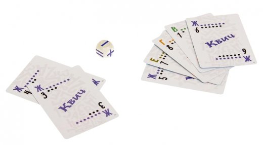 Перед вами настольная игра «Квич», которая понравится детям от 7 лет. В начале игры каждый участник получает по 5 карт, на которых изображено по 1 цифре и 1 букве. После броска кубика с гранями с математическими операциями («равно», «плюс», «минус» и т.д.) необходимо избавиться от своих карт.
