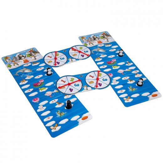 Самый юный участник начинает игру. Раскручиваются стрелки двух барабанов. Игроки передвигают свои фишки пингвинов на поле согласно сумме двух выпавших на барабанах чисел.